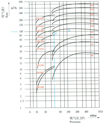 注:該性能曲線是在吸入介質為20οC的飽和空氣,工作液溫度15οC,排氣壓力1013mbar的狀態下得到的,性能允差±10%,圖中左側為配用大氣噴射器的性能曲線。